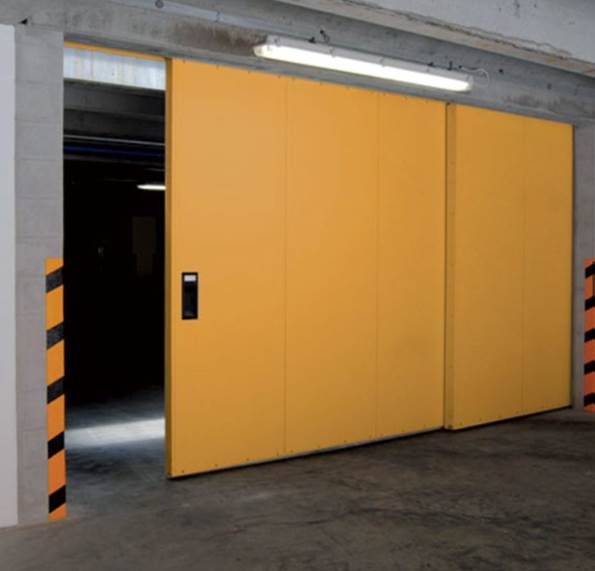 Portone tagliafuoco metallico monolaterale ad ante sovrapposte, ideale per applicazioni ove gli ingombri sono ridotti o le esigenze di installazione richiedano spazi ristretti per lo scorrimento delle ante.